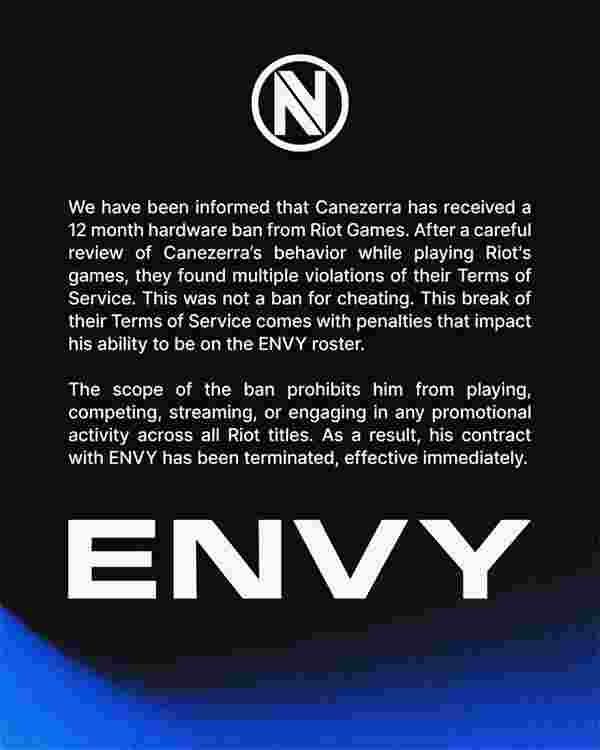 Envy已终止与canezerra的合同,此前他收到了拳头公司为期12个月的硬件封禁。对其在游戏中行为的审查发现,他多次违反了公司的服务条款。Envy在声明中强调,canezerra的封禁并非因为作弊,而违反游戏服务条款是其解约决定的核心原因。