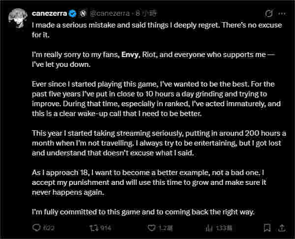 canezerra对此回应道:“我真的很抱歉,对不起我的粉丝、Envy以及所有支持我的人——我让你们失望了。自从我开始玩这款游戏,我就一直想成为最强者。过去五年里,我每天投入近10个小时刻苦训练、努力提升。在那段时间里,尤其是在排位赛中,我的行为很不成熟,这次事件是一个明确的警醒,我必须变得更好。我对这款游戏充满热情,并且会以正确的方式回归。”