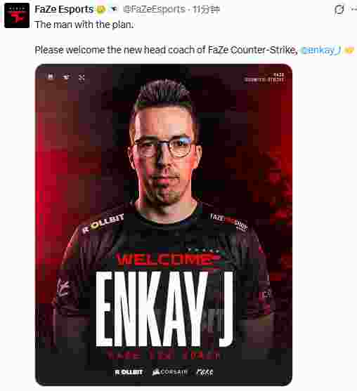 FaZe俱乐部官推发布公告,enkay J将加盟FaZe出任教练。