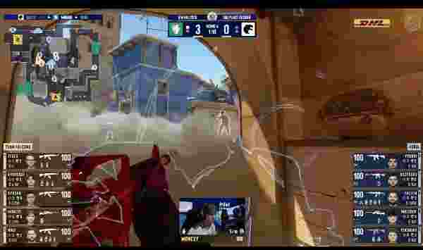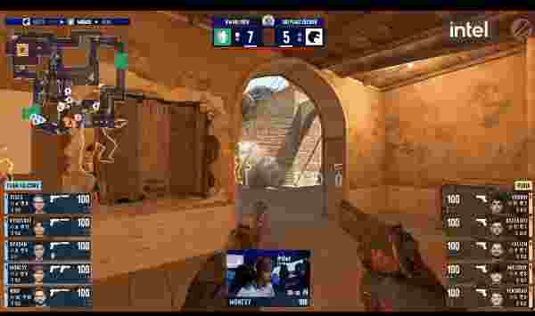 图一来到FURIA选择的Dust2,Falcons选择CT开局。手枪局上来KSCERATO就是一波四杀瞬间点燃观众激情,随着Falcons钢枪无果,比分直接来到3-0。第四回合,在先掉两人的情况下,A斜坡m0NESY 大狙抗压完成双杀成功拖到队友回防拿下这一分,下回合经济不佳的FURIA只能强起,kyousuke B区接住三人成功将FURIA送入经济局,比分随之来到3-3。第七回合Falcons极限时间B区回防没有完成拆包,下一回合Falcons A道完成一换二,后续A平台下包阵地战黑豹略显吃力再丢一分的同时又将自己送入经济局,比分随之来到4-5。第十回合FURIA第二时间选择静音接触B区大成功,好在TeSeS残局完成三杀逆转局势,下一回合m0NESY再发威拿下三杀,上半场最终回合NiKo和m0NESY双人再砍五杀,最终将比分定格在8-4。