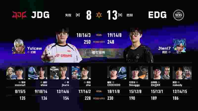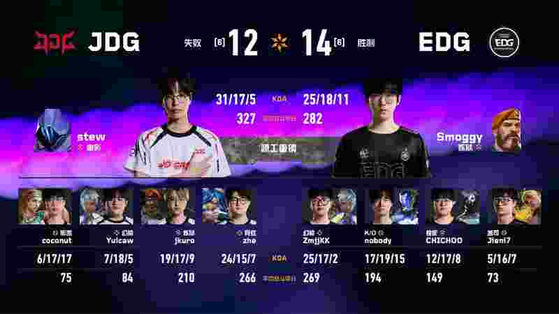 下半场前两分由JDG拿下,分差扩大至八分。第十五回合,EDG多人发挥追回一分。第十六回合,EDG再追一分。第十七回合,
