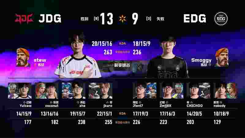 Wan Shunzhi (万顺治) | CHICHOO三杀帮助EDG再追一分,分差缩小至五分。第二十一回合,jkuro四杀,JDG率先拿到赛点。最后一回合,Yuicaw终结比赛。JDG以13-9赢下图一。