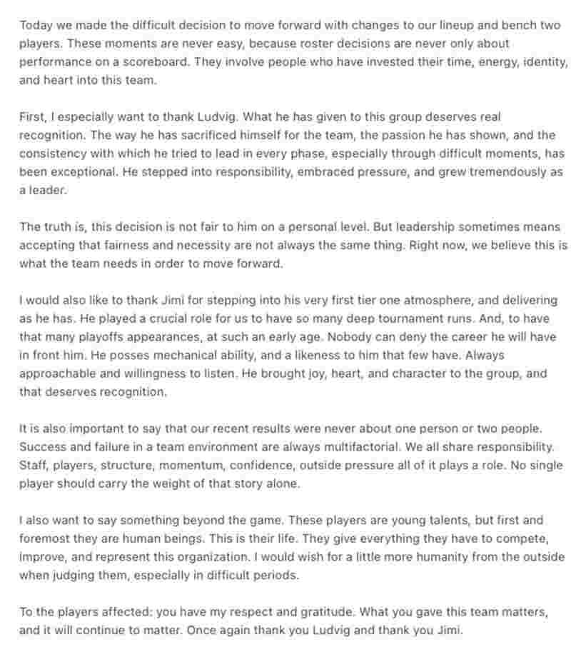 sycrone:“今天我们做出了一个艰难的决定,将对我们的阵容进行调整,并将两名选手下放至替补席。 这样的时刻从来都不容易,因为阵容决策从来都不只是关乎赛场上的表现。这关系到那些将自己的时间、精力、自我和心血投入到这支队伍中的人。