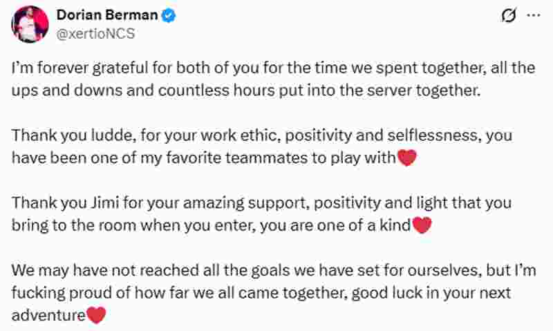 xertioN:“我永远感激你们两位,感激我们共同度过的时光,一起经历的所有起起伏伏,以及在服务器里共同投入的无数个小时。