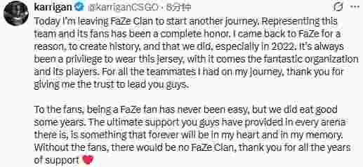 FaZe官宣karrigan离队后,大表哥在X发布了离队动态。
