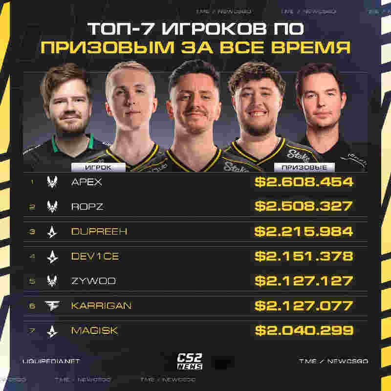 Vitality战队的最佳指挥和最佳自由人的荣誉簿上再添一项纪录——apEX与ropz成为CS历史上唯二奖金收入突破250万美元的选手,领跑职业选手生涯总奖金榜。