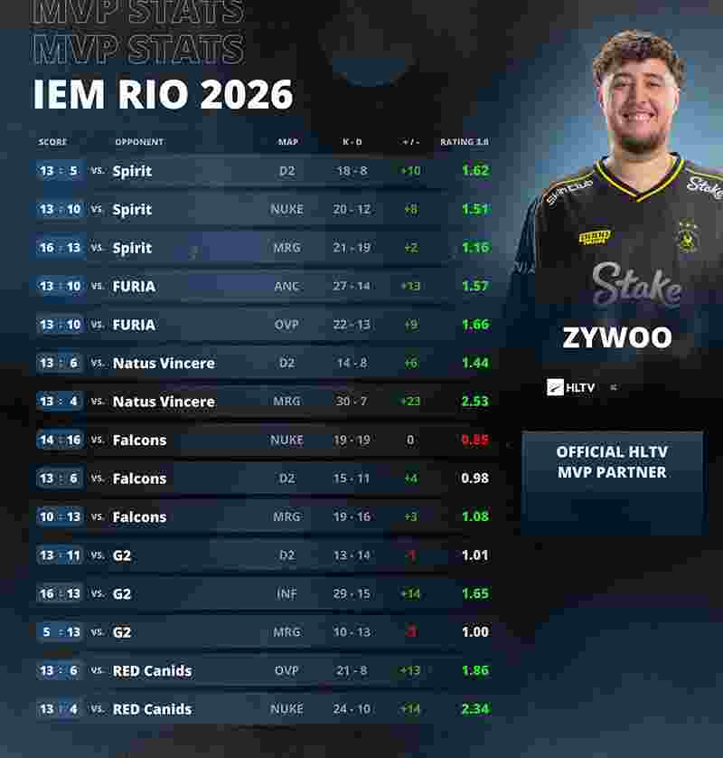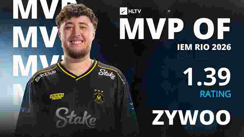 Vitality的明星狙击手ZywOo以1.39 Rating成功荣膺IEM里约 2026的MVP,同时也收获了他职业生涯的第三十一块MVP奖牌。