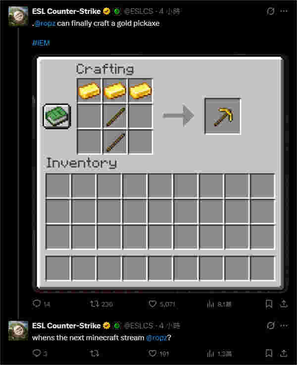 “ropz,终于可以合成一把金镐了。”——暗指《我的世界》中三根金条能合成一把金镐,而ropz手里正握着三座大满贯的金条奖励。