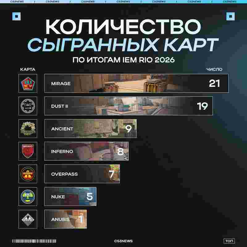 今日外媒统计了IEM里约2026各地图的出场次数。