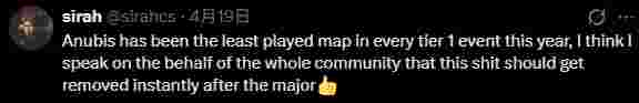 “Anubis是今年每个一线赛事中出场率最低的地图。我想代表整个社区说一句:这破图应该在Major之后立刻被移除。”