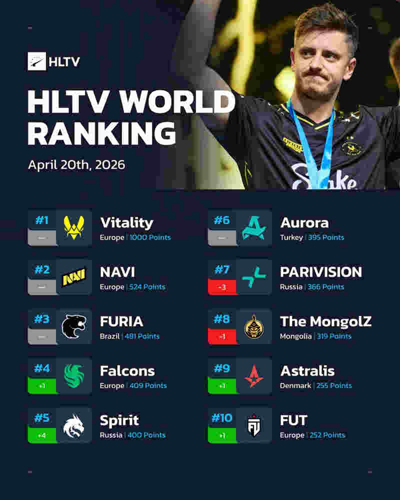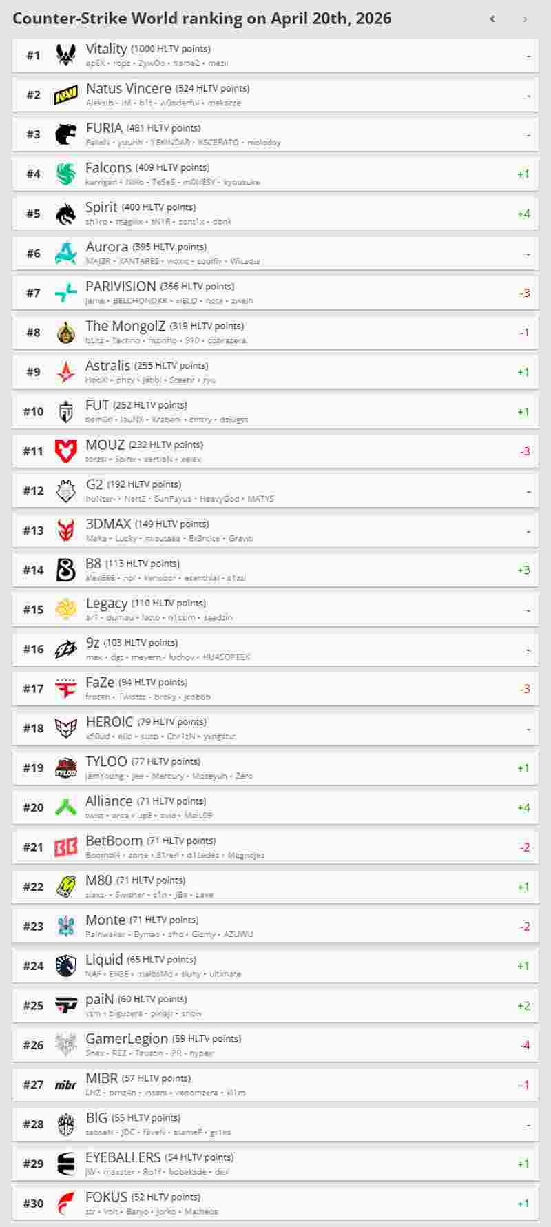今天凌晨HLTV更新了最新一期世界排名,受刚刚结束的IEM里约2026影响,本周排名迎来一轮较大范围的洗牌。