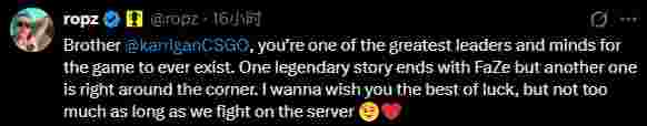 “兄弟@karrigan,你是有史以来最伟大的领袖之一,也是这个游戏中最睿智的人之一。一段传奇的故事在FaZe结束了,但下一段故事就在眼前。我祝你一切好运,但只要我们还在赛场上交手,就别太好运哦。”