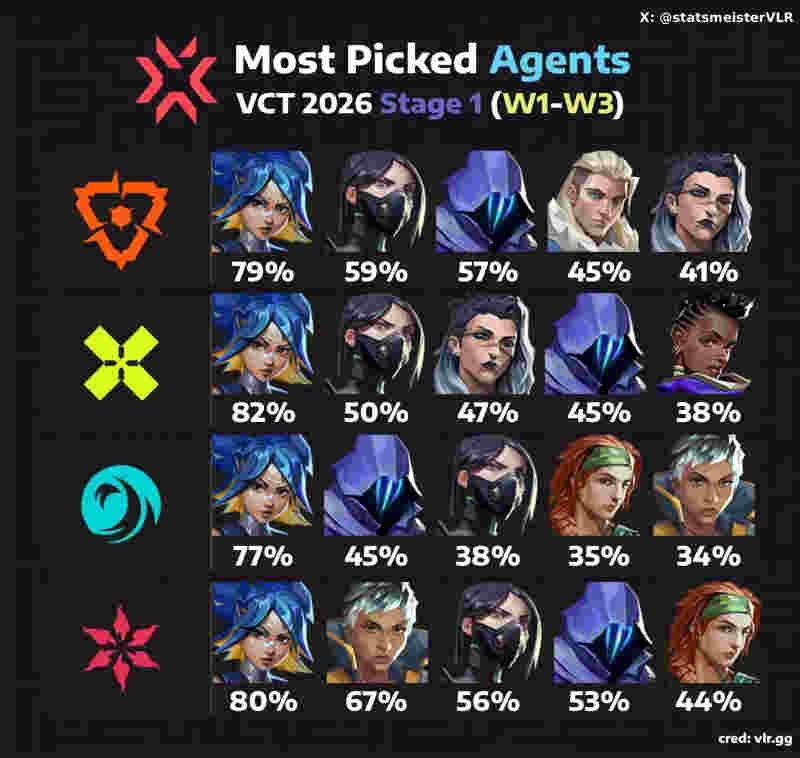 外媒统计2026VCT第一赛段常规赛前三周四大赛区英雄登场率(注:CN赛区第一赛段常规赛已完结):