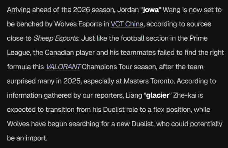 “在2026赛季开始前加入队伍的jowa即将被狼队下放至替补席。据记者收集到的信息,glacier预计将从决斗位转为自由人,而狼队已经开始寻找新的决斗,可能是一名外援。”