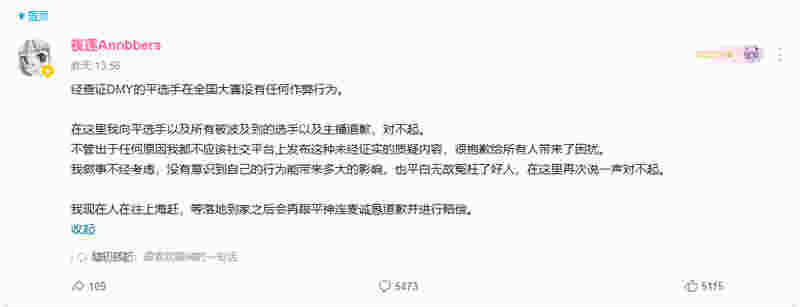 在这里我向平选手以及所有被波及到的选手以及主播道歉,对不起。不管出于任何原因我都不应该社交平台上发布这种未经证实的质疑内容,很抱歉给所有人带来了困扰。我做事不经考虑,没有意识到自己的行为能带来多大的影响,也平白无故冤枉了好人,在这里再次说一声对不起。