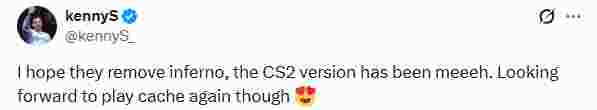 CS狙击魔术师kennyS在X账号上表示,他认为Cache应该取代Inferno进入当前服役地图池。