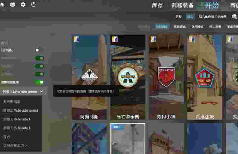 您可以直接前往CS游戏内创建【练习】对局,并在左侧选中启用5E地图指南。