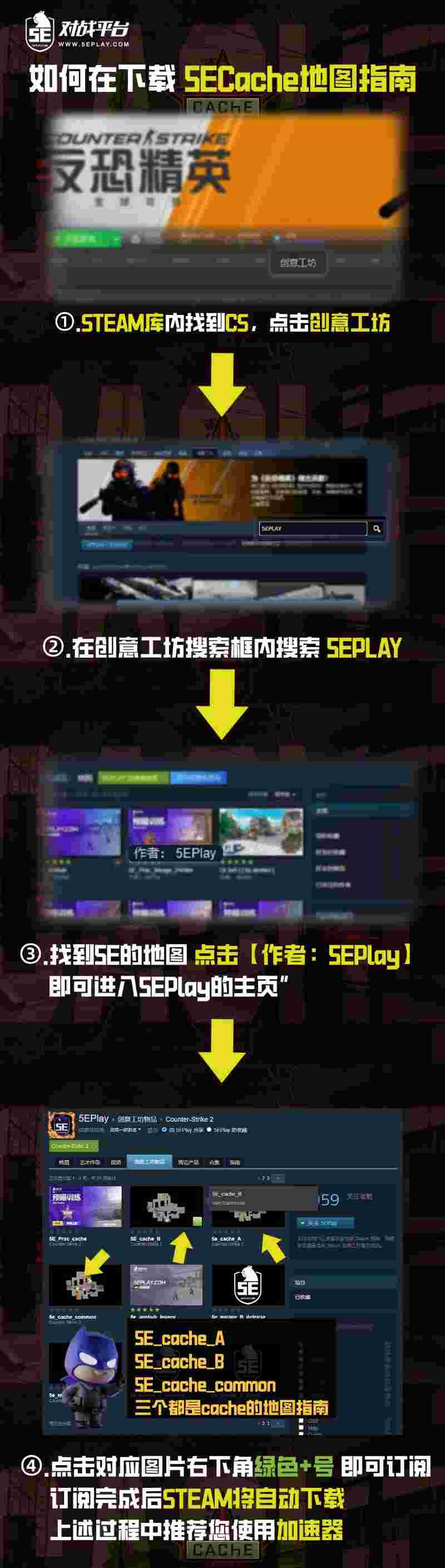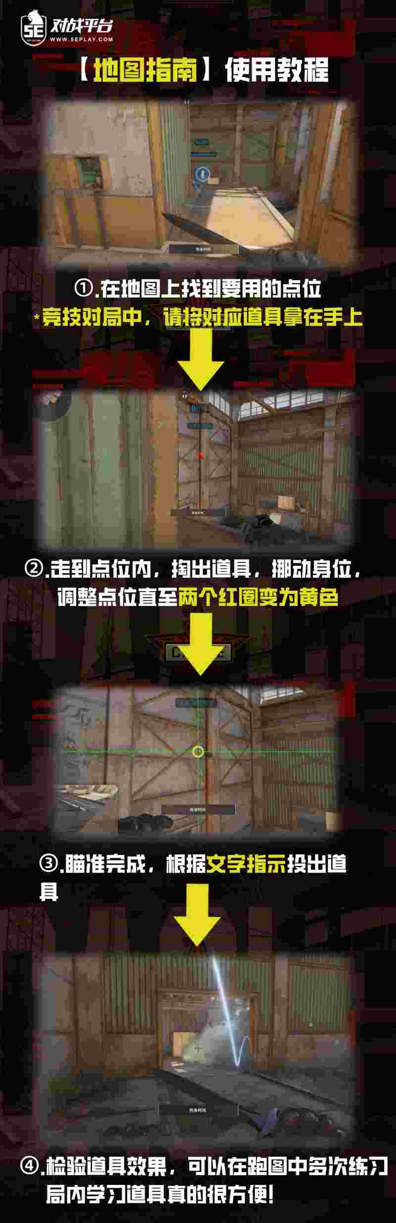 随着新地图的上线,5E对战平台也同步推出了配套Cache的【地图指南】,让您在对局之中也可以根据【地图指南】的指示丢出基础的道具。