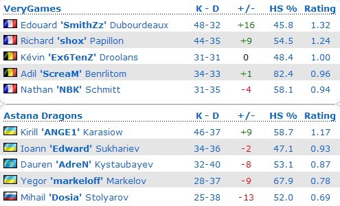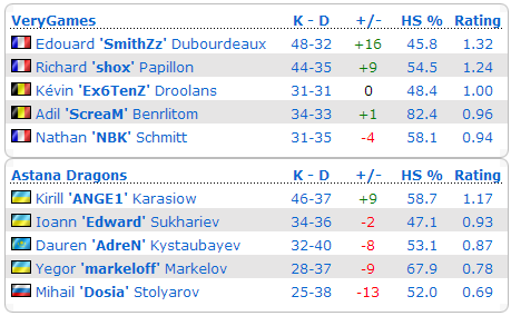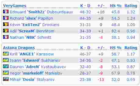 法国巨舰VeryGames在SLTV StarSeries VII线下决赛总决赛3:0击败独联体梦之队Astana Dragons(16:12 de_mirage_ce,16:9 de_inferno_se)后问鼎冠军并斩获$7,000。
