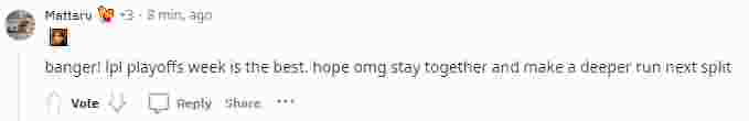 “够味儿,LPL的季后赛周太棒了。希望OMG的选手们能一起在下个赛季走得更远。”