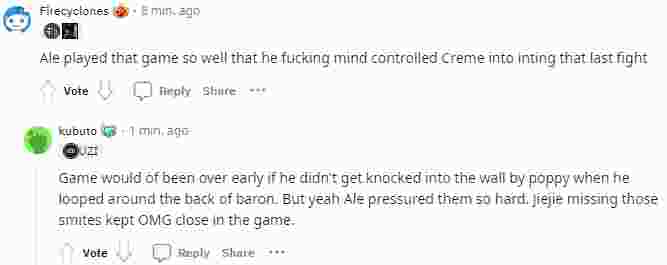 “ALE这场比赛打得太好了,他精神控制了CREME让他在最后一波团战里送掉了。”