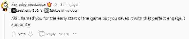 “对不起AKI,在比赛早期我还在觉得你没用,但是你用完美的开团拯救了队伍,我道歉。”