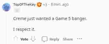 “CREME只是想给大伙们看看第五局比赛。对此我表示尊敬。”