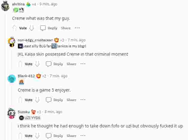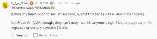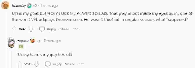 “UZI是我心中的GOAT,但是天哪他这个系列赛打得太差了。下路那波看得我眼睛都要瞎了,这绝对是我见过LPL最烂的AD操作之一。他在常规赛还没这么差的,发生了什么?”
