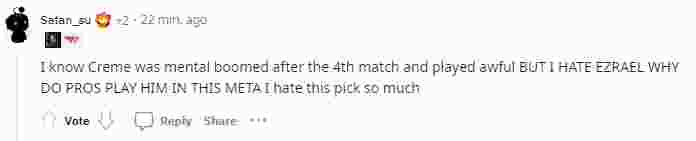 “我知道CREME在第四场比赛送掉以后可能心态上出了些问题所以打得很烂,但是我真的讨厌EZ这个选择,为什么要在这个版本这么重要的比赛里选择这个英雄。”