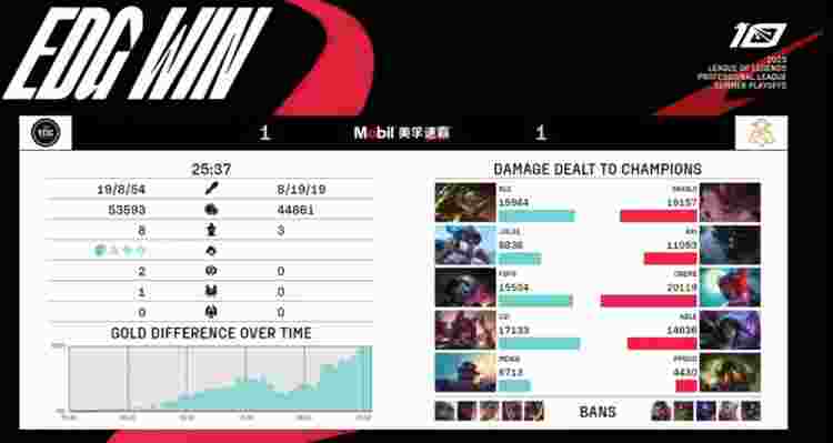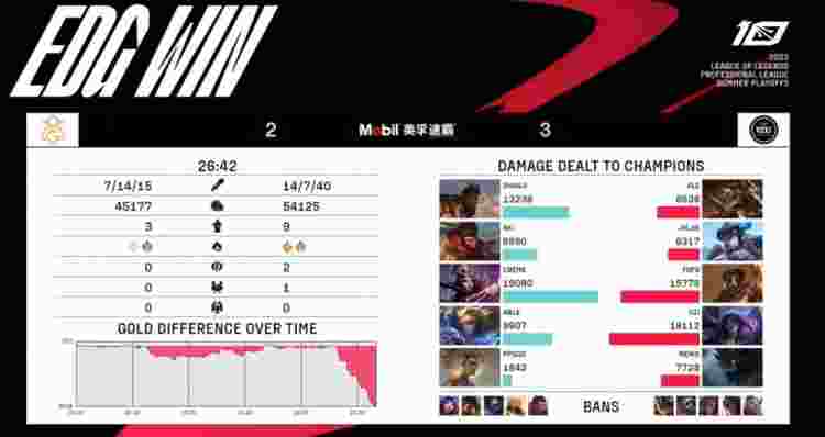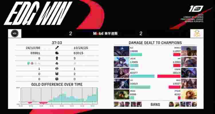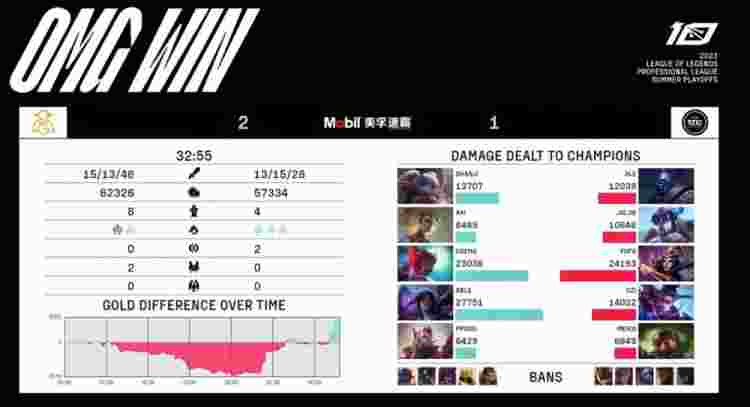 OMG选出了一套拼前期的阵容,但是小龙团EDG先打出0换2!虽然随后AKi猴子几波支援拿下四个击杀!但是关键的小龙团Creme乐芙兰一次单人绕后白给,一次双踩poke被Meiko大树捆住白给之后OMG丧失了团战主动权!EDG趁势赢团收下大龙,随后下野一波配合先秒Able伊泽瑞尔,多个人的EDG抓住复活CD先推中路高地转上,OMG绝命一波没有伤害被EDG反手追击打出0换4!EDG趁势结束比赛,晋级下一轮的同时确保了自己的一个冒泡赛的名额!