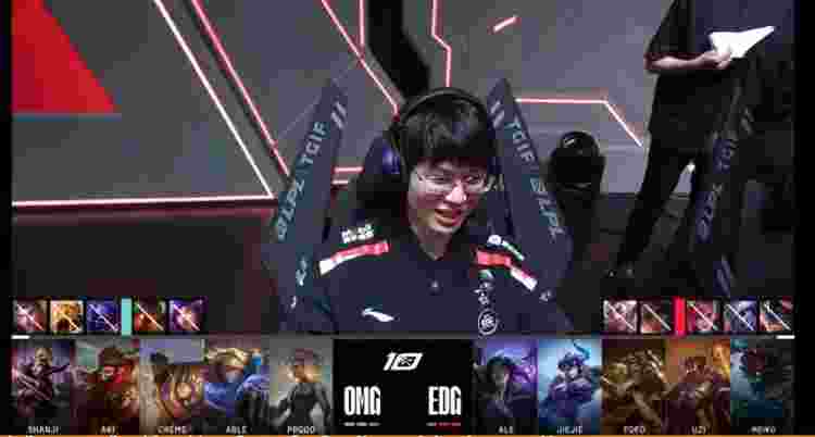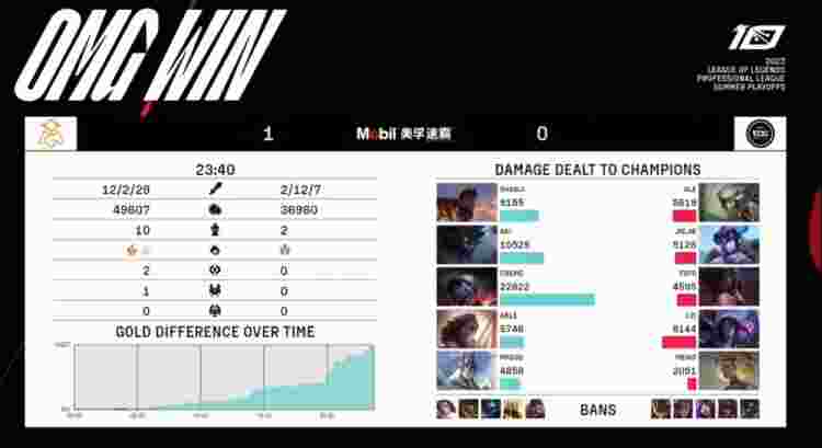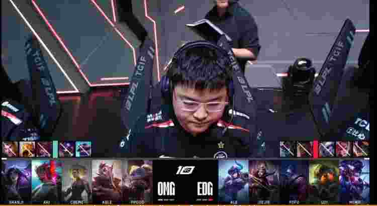 【22:50】双方经济拉开到一万,AKi大树大招直接掩护队友拆高地塔!EDG众人冲锋All-in终于秒掉了Able的莎弥拉!但是后方的Creme小炮没人管了输出拉满!随后shanji奎桑提进场让EDG难以处理,随着Uzi卡莎被小炮单人一套伤害直接炸死,OMG打出1换4一波结束首局比赛!