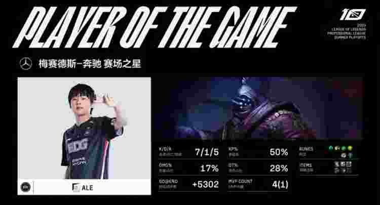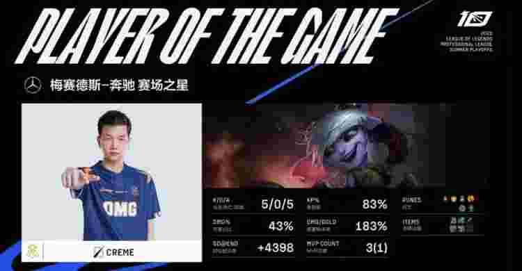 Creme选出中单卡莎,开局Uzi金克丝操作失误送出一血,但是上路Ale贾克斯一打二双杀帮助队伍顶住局势!中期团战Uzi金克丝再被锤飞的情况下大火箭双杀激发罪恶快感四杀收割!EDG掌握主动权,但是OMG也不愿放弃,Creme卡莎两波命换命强杀Uzi金克丝之后帮助OMG拿下了大龙!EDG则是拿到了风龙魂!关键的远古龙团Ale贾克斯绕后被打残,Creme卡莎想当英雄飞到EDG人群里直接白给了!EDG趁势追击团灭OMG,扳平了比分!
