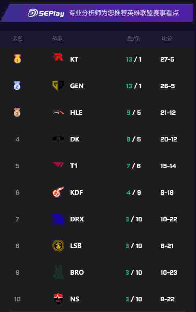 而KT战胜GEN后,成功超越GEN成为LCK第一。LCK赛区目前常规赛正在火热开打,最新消息我们将第一时间报道!