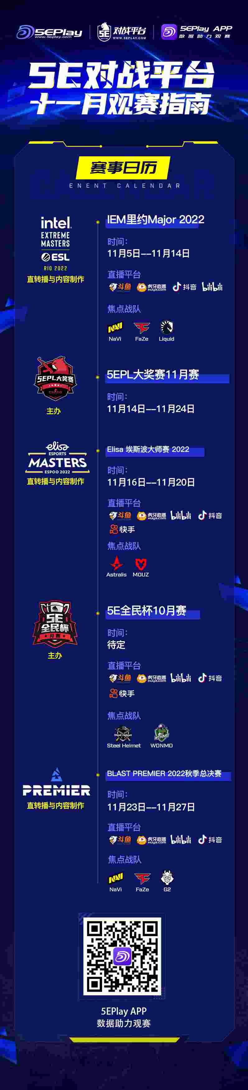 CSGO殿堂级赛事Major正在里约如火如荼的进行着,本月的上半部分的主题只能是IEM里约Major。但11月的美妙却不止于此,本月中旬我们将在Elisa埃斯波大师赛上与老友device相见,月底的BLAST秋季总决赛大伙儿最爱的G2战队也将会重新亮相。5EPlay将在本月继续为大家带来国内外多项精彩赛事的直转播和内容制作,敬请期待!