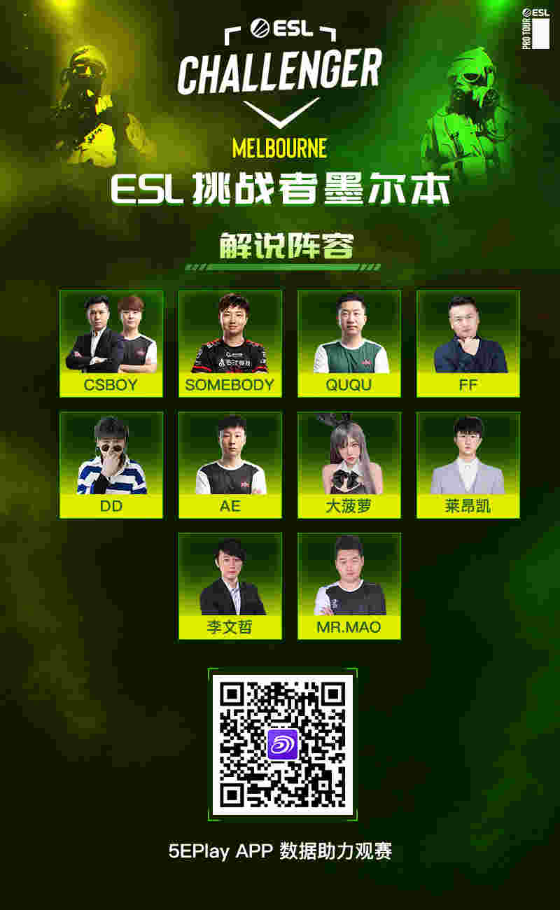 本次ESL 挑战者 墨尔本 2023,大家熟悉的CSBOY、SOMEBODY与QUQU等虎牙知名主播都将成为赛事中文特约解说!他们将在各自的直播间内,通过专业与趣味兼具的视角,为大家带来精彩的赛事评述。同时5EPlay APP也将继续为主播与玩家提供最及时的赛事数据,帮助玩家第一时间感受到ESL 挑战者 墨尔本 2023赛事的魅力。