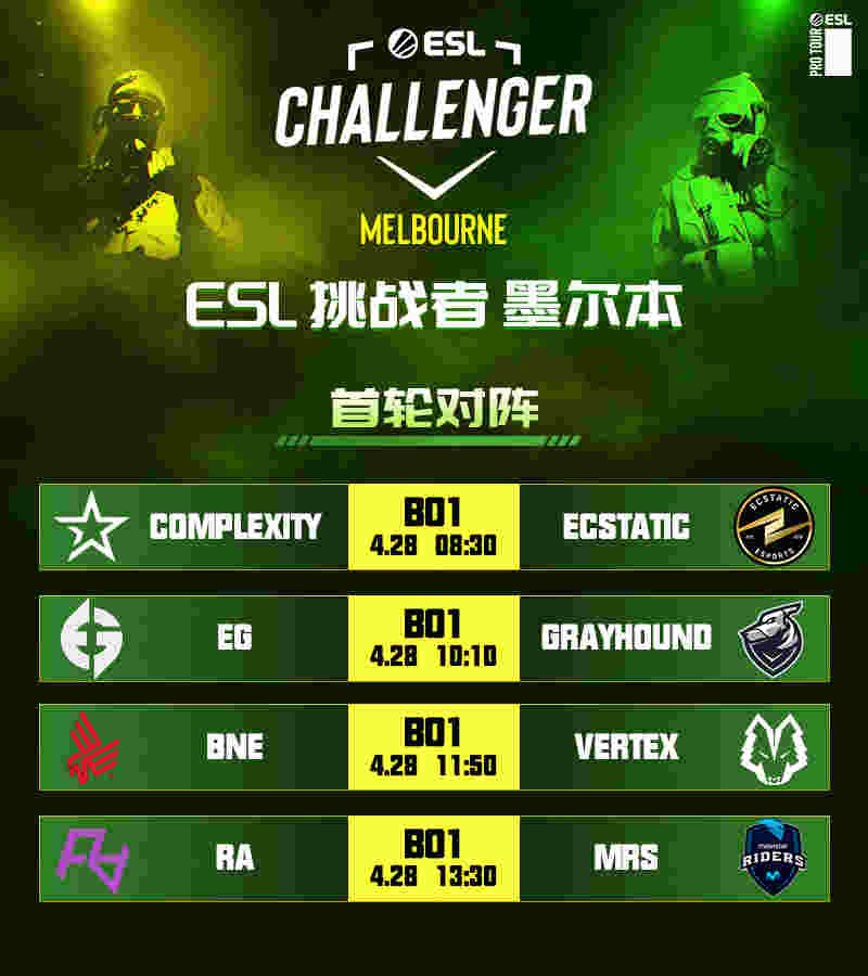 本次赛事的揭幕战Complexity对阵ECSTATIC将在4月28日8:30正式打响,RA将在同日下午13:30对阵MRS,请大家届时收看!