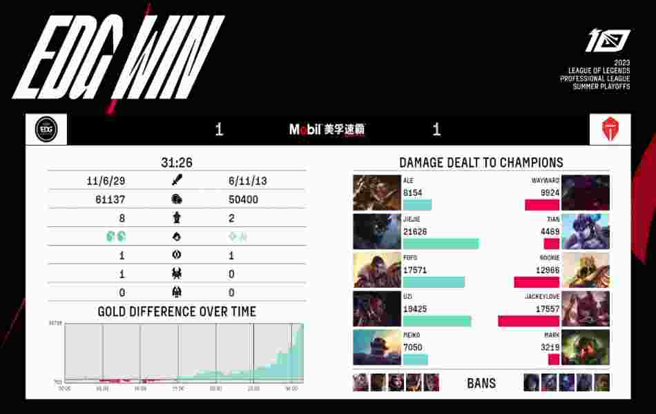 第4分钟猪妹来到下路,配合队友成功抓死布隆。第7分钟双方打野都来到下路,打成一换一后拉开。第10分钟下路爆发团战,EDG上野全都赶到,但TES反手将布隆击杀。第16分钟EDG四人来上路越塔击杀了沙皇,随后TES众人赶到,也击杀了布隆。第25分钟中路爆发团战,EDG将泰坦击杀,转身拿下小龙。第28分钟EDG在河道击杀奥恩后拿下大龙,第30分钟EDG抱团推中,卢锡安完美输出,成功团灭TES,EDG顺势一波结束了比赛。
