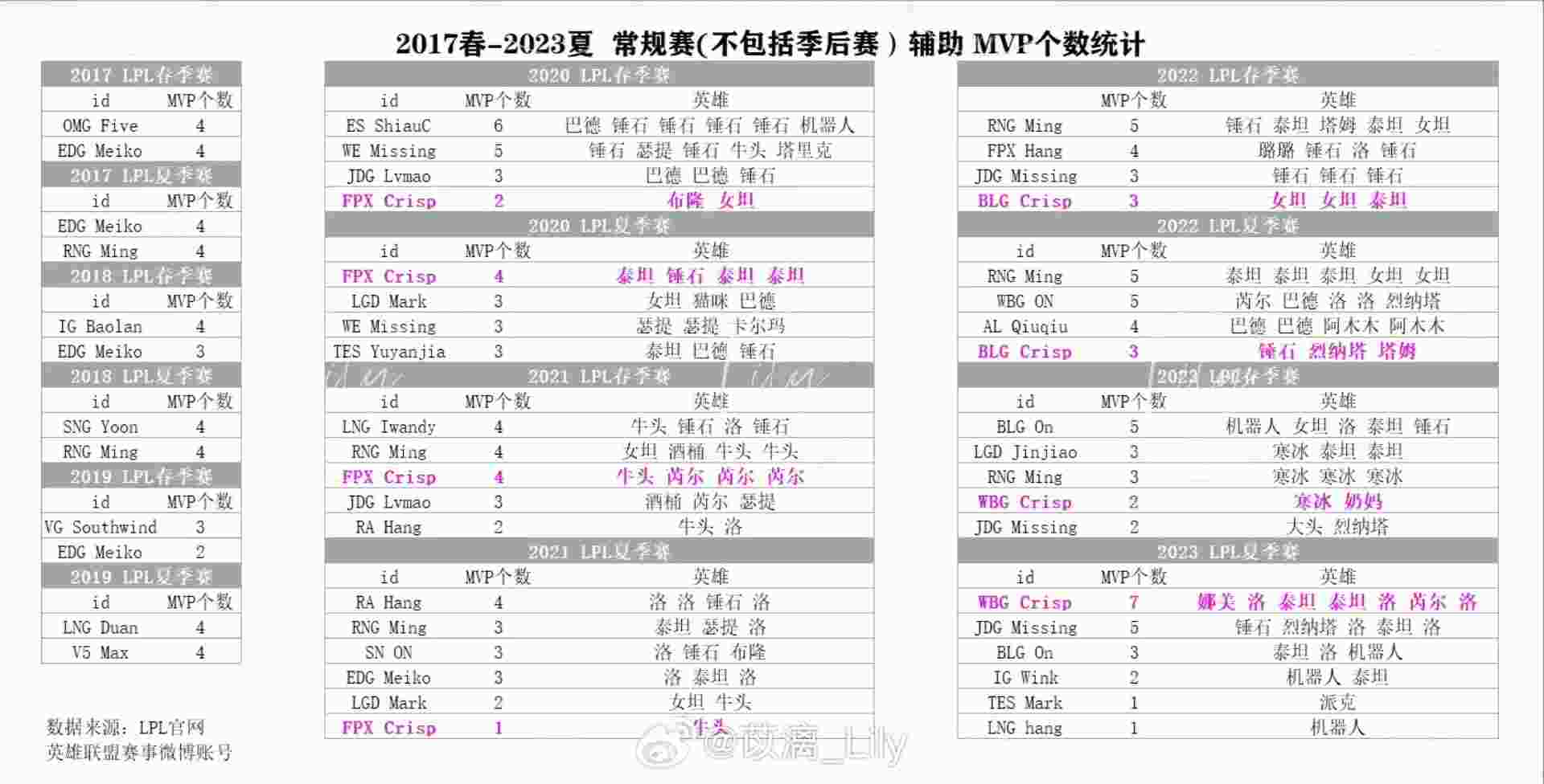 CRISP选手本赛季收获7个MVP,是全联盟辅助中MVP次数最多的选手,在联盟全位置选手中7次MVP也能排到并列第9的位置。