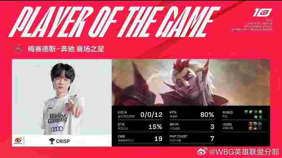 在昨天LPL夏季赛常规赛的收官日中,WBG2:0击败EDG。WBG队内辅助选手CRISP两场比赛的洛和芮尔也是凭借完美的开团表现和控制衔接砍下1-3-40的恐怖数据帮助队伍取得胜利。