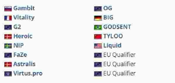 官方宣布包含总共11支队伍的直邀名单,除了之前提到的那些之外,NIP、FaZe、Astralis、Virtus.pro与OG的加入象征着世界排名前十的战队将有9支到场,同时BIG与Liquid分别位列世界排名第11与12位,Top 12的队伍中仅差NaVi一队。