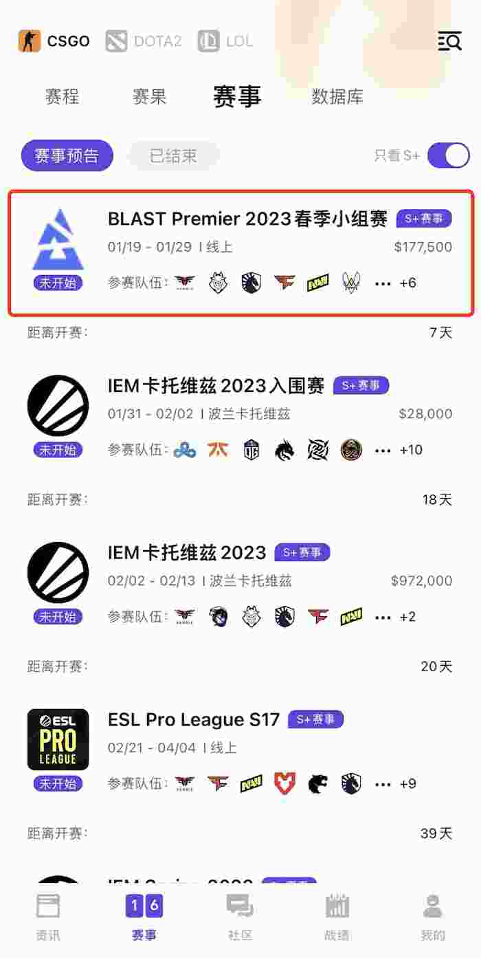1. 点击App下方赛事版块,进入BLAST春季小组赛赛事页面。