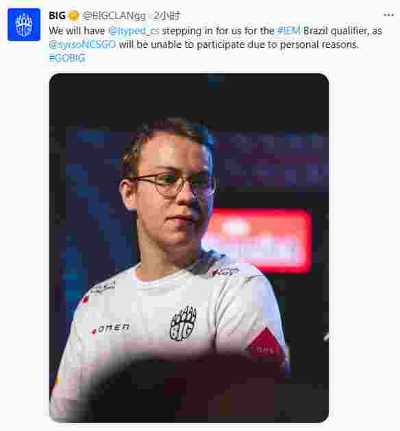 BIG的官推在今晚的比赛之前发布消息称他们将使用hyped参加IEM巴西预选赛,而syrsoN因为个人原因无法参赛。
