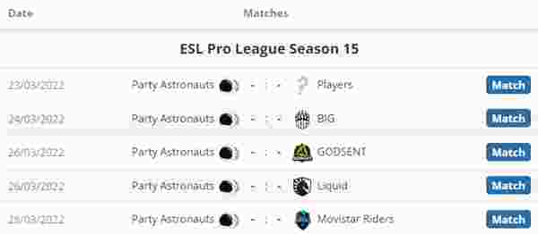 北美战队Party Astronauts的阵中的大多数选手均是北美赛区二三线赛事中的佼佼者,不论是PwnAlone、Jonji还是djay都在各类北美锦标赛摸爬滚打多年。2021年10月结束的ESEA Premier S38北美区的决赛中他们击败Extra Salt,成功拿到EPL的参赛资格,这将是他们在大型赛事中的首次登场,平心而论,公众对这支队伍的期望很低,但他们总能带来惊喜。