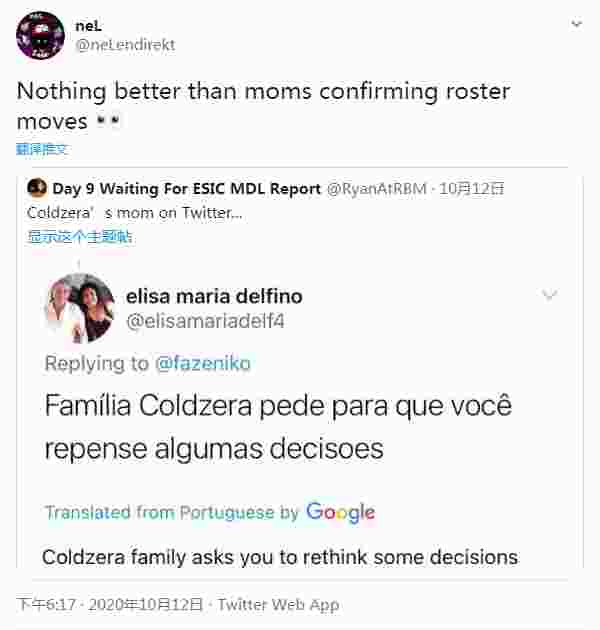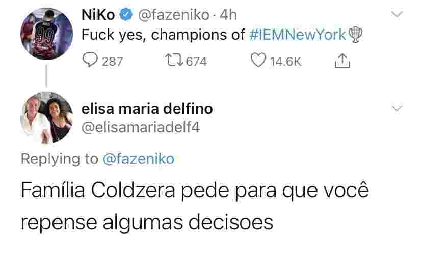 赛后,NiKo及Kjaerbye等人纷纷在个人社交媒体发文。不过有趣的是,巴西选手coldzera的母亲回复了NiKo这条庆祝夺冠的推文,她表示“我觉得你该重新考虑一下某些决定。”(现已删除)