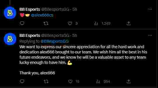 “我们想对alex666带给我们团队的所有努力和奉献表以真挚的感谢。我们祝愿他在未来的工作中一切顺利,我们知道,不论他加入哪个战队,他都将成为队伍的宝贵财富。”