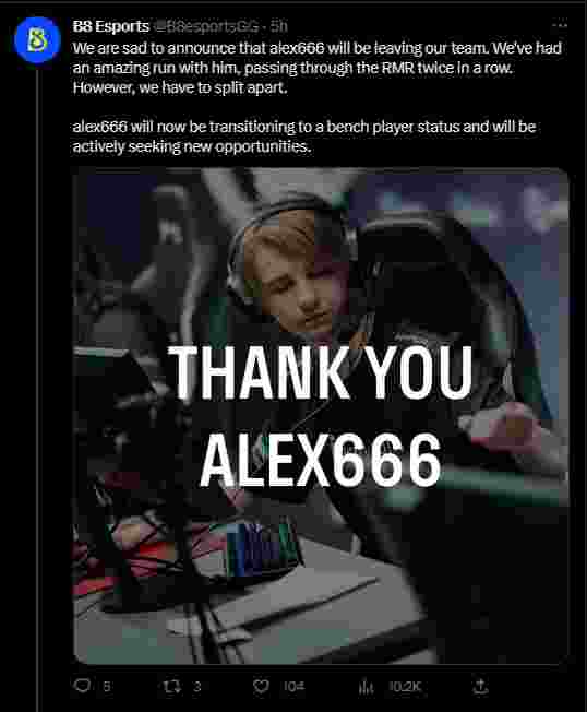 “我们很遗憾地宣布,alex666将离开我们的团队。我们和他度过了两次RMR的奇妙时光。然而,我们不得不分开了。”