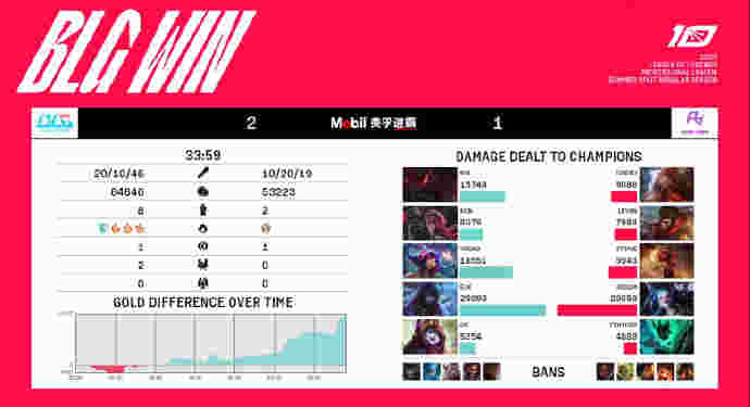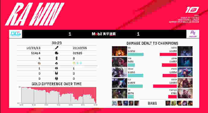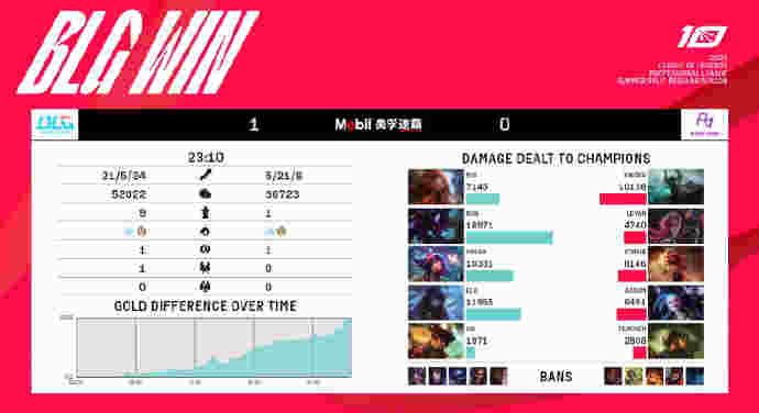 20分钟刚过BLG已经完全掌控了上半区视野,趁着RA不敢上前直接Rush掉大龙并且放掉小龙直接推掉中路高地,螳螂与妮蔻在小龙坑发现刚刚打完龙正在回城的RA队员,上前干扰轻松收获击杀,BLG大部队顺势从正面推进击溃RA的抵抗仅用23分钟就早早结束了比赛,恭喜BLG取得1-0领先。