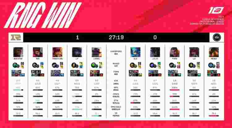 第一局前期Breathe奎桑提成功预判Ale格温闪现位置拿到一血,先锋团虽然双方打出1换1,但LP拿到先锋之眼爽吃塔皮,RNG前期拿到2K经济优势。中期RNG通过运营拿到4K经济优势,小龙团战LP先杀Ale后又闪现向前拿到四杀,RNG0换5团灭EDG回头收掉大龙,经济优势已达8K,随后RNG下路一波冲上EDG高地,将其击溃并推平基地先下一城。