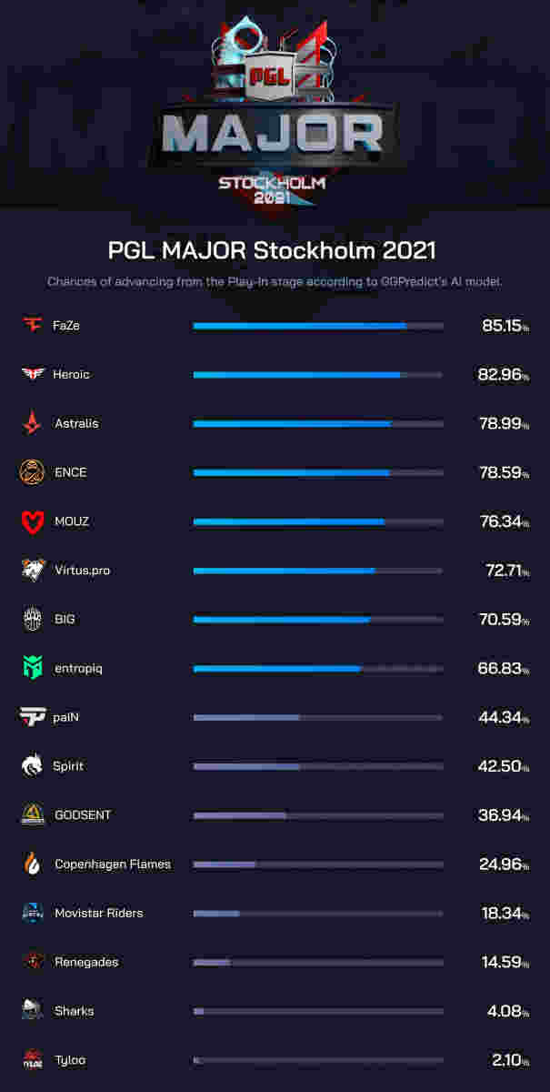 近日,海外机构用AI智能系统模拟并预测了PGL斯德哥尔摩Major赛事,结果AI预测FaZe和Heroic等八支队伍是获得新挑战者组出线希望最大的队伍。