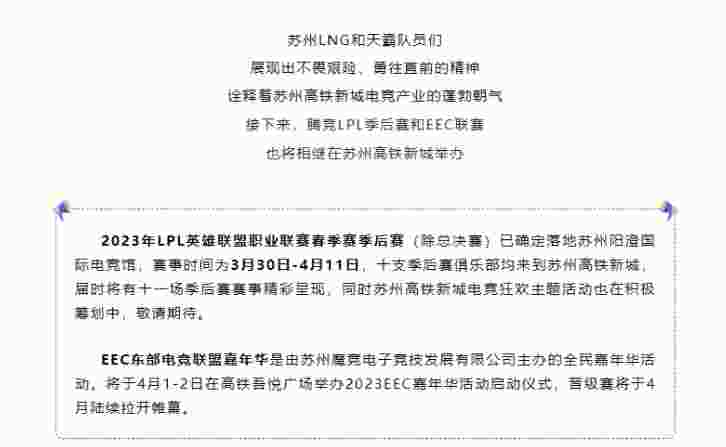 北京时间3月18日,2023LPL春季赛季后赛场地确定在苏州阳澄国际电竞馆。